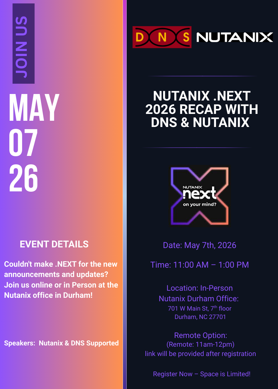 Durham NC, Nutanix .NEXT 2026 Recap with DNS & Nutanix Thursday, May 7, 2026 11:00 AM 1:00 PM 11:00 13:00 Google Calendar ICS REGISTER hERE